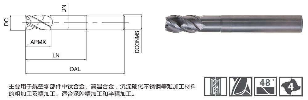 主要用于航空零部件中钛合金、高温合金,沉淀硬化不锈钢等难加工材料的粗加工及精加工。适合深腔精加工和半精加工。