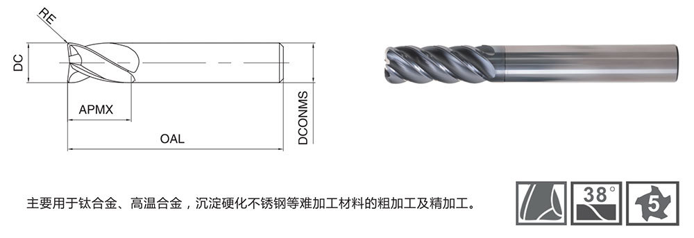 5齿U型设计,底齿不过中心,更大限度的增加了容屑空间。避免了底齿中心切削速度低易崩齿的现象!加工合金(Tc4/Tc18/Tc21)锻造高温合金(GH4169)沉淀硬化不锈钢(17-4PH/15-5PH)的利器。